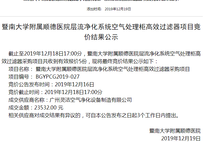 靈潔為暨南大學(xué)附屬順德醫(yī)院層流凈化系統(tǒng)高效過(guò)濾器項(xiàng)目順利完工