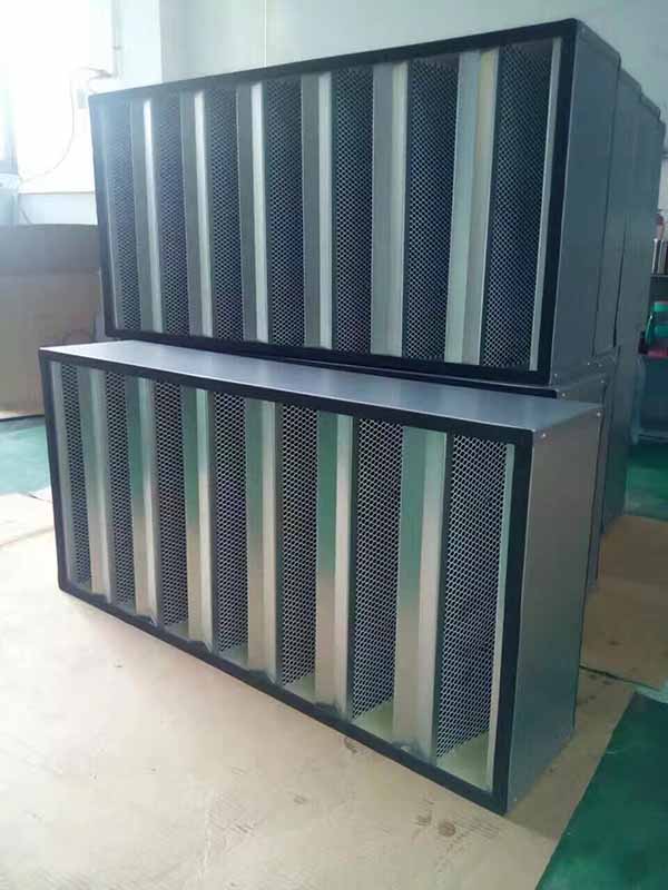 組合式活性炭過濾器也叫V型活性碳過濾器,主要 采用的顆粒狀活性炭如椰殼活性炭、柱狀活性炭等,均勻灌注并封存在特定的蜂窩狀基材內(nèi),四周可采用紙邊框、鋁合金邊框或不銹鋼